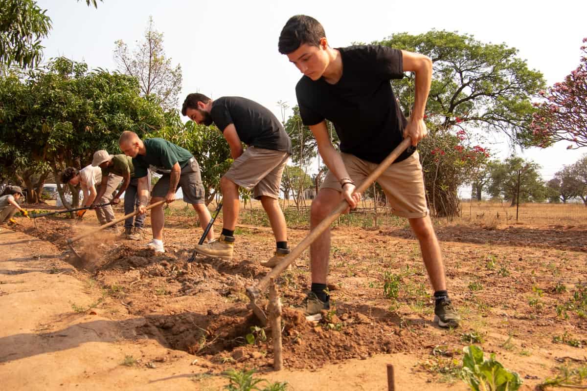 Unter Anleitung von Tailo legen wir drei neue Gemüsebeete an. Um die wenigen, aber oft heftigen Regenfälle besser zu nutzen, erstellen wir kleine «Hochbeete», die von einem Erdwall umgeben sind, um das Wasser zurückzuhalten.